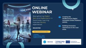 The REVIVE project, co-financed by the European Union, organizes a webinar addressed to all its stakeholders to present the potential of digital services and advanced technologies for the economic and social development of the rural areas. Special focus will be given to the Mediterranean Digital Innovation Online Platform (MDIH) Online Platform that the REVIVE project is creating. The aim of the platform is to create a data collection space to store data of the innovative supply chain processes from different pilots at regional and Mediterranean level. Data will be gathered in a user-friendly common online platform for data collection and sharing to create a database of MED innovative solutions for business models. In addition, our pilot areas will showcase the developed digital and immersive experiences that are tailored on the peculiarities and characteristics of each pilot area.